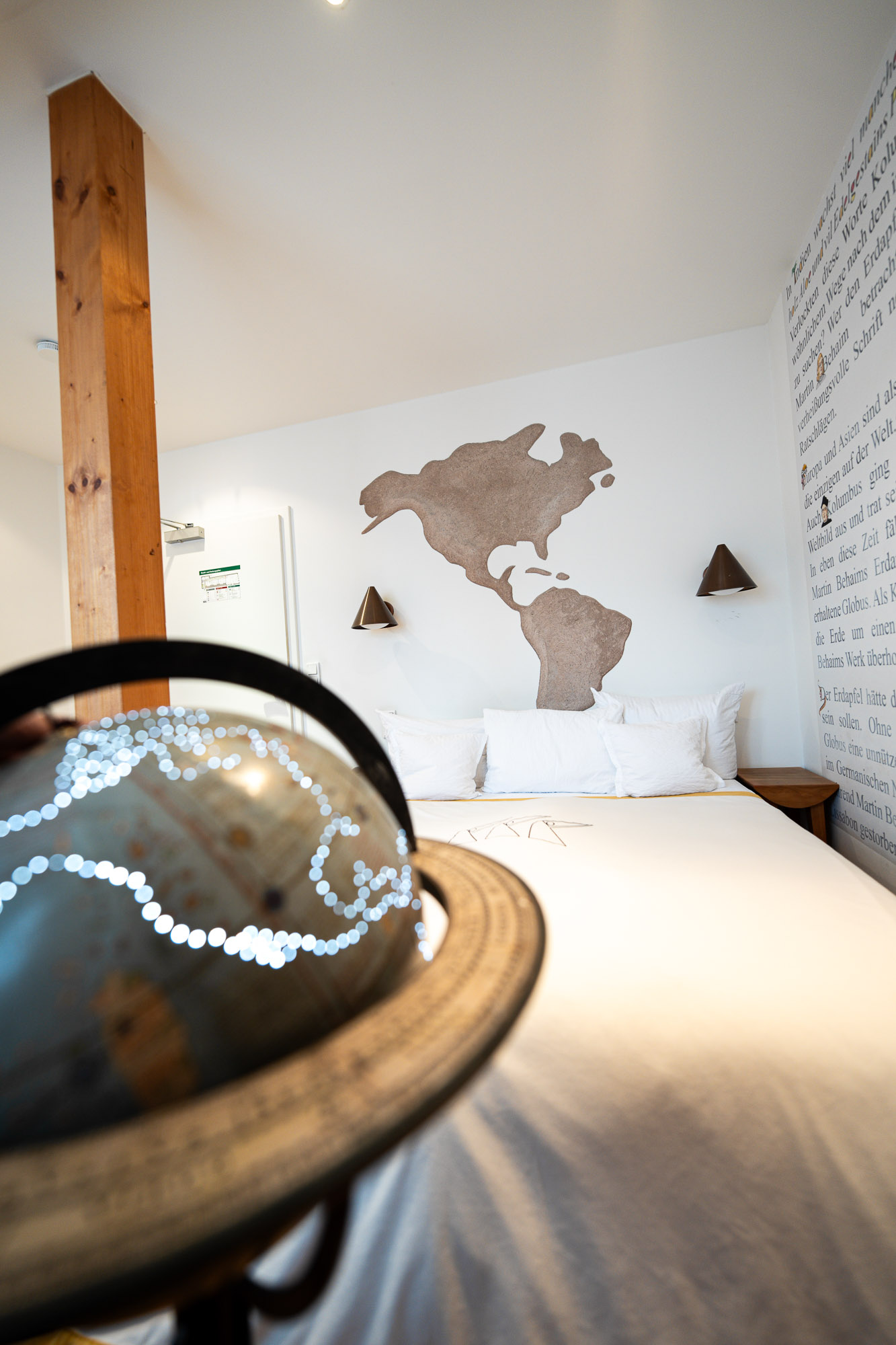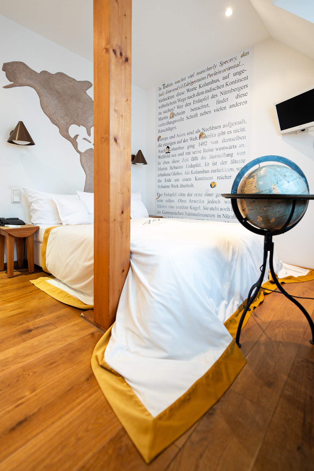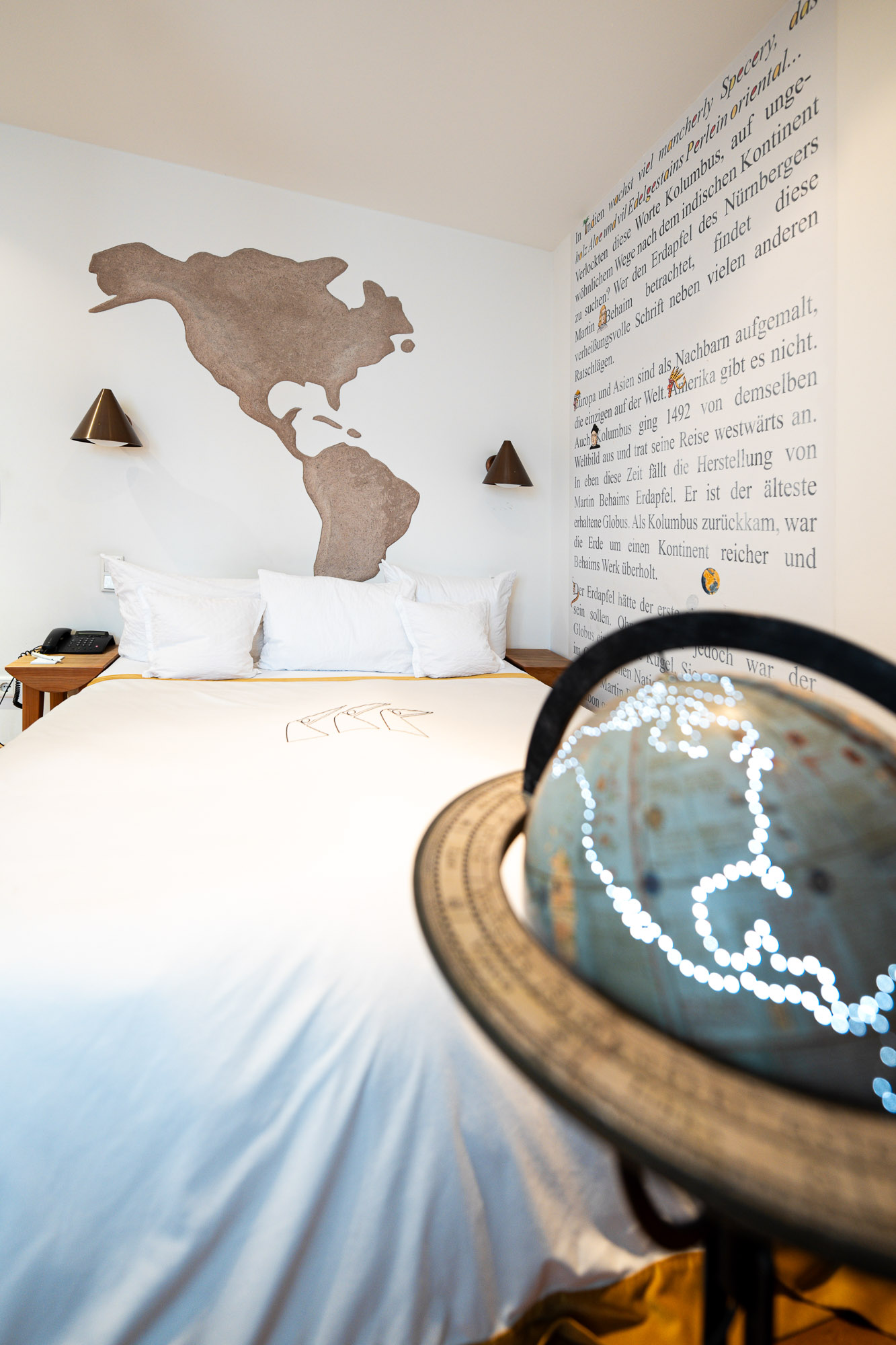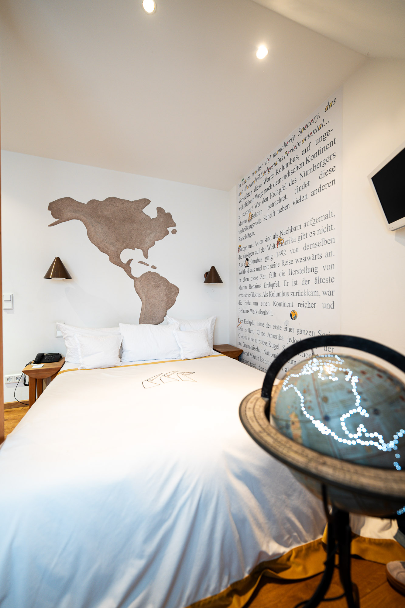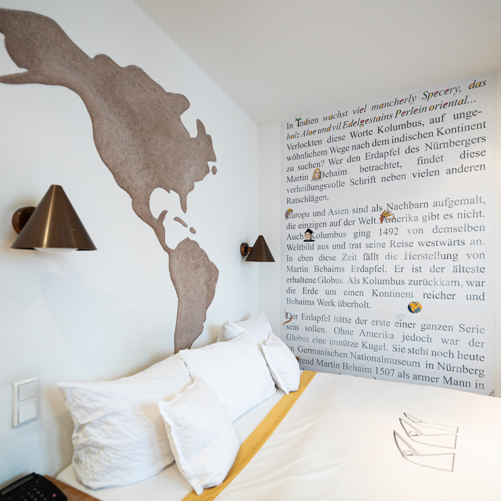Europa und Asien sind als Nachbarn aufgemalt, die einzigen auf der Welt. Amerika gibt es nicht. Auch Kolumbus ging 1492 von demselben Weltbild aus und trat seine Reise westwärts an. In eben diese Zeit fällt die Herstellung von Martin Behaims Erdapfel. Es ist der älteste erhaltene Globus. Als Kolumbus zurückkam, war die Erde um einen Kontinent reicher und Behaims Werk überholt.